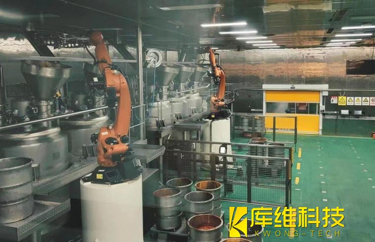 每當AVG機器人將原料運輸到機器人手臂身邊,哪桶裝的是辣椒、哪桶裝的是牛油、哪桶又是蔥姜蒜,都會被機器人手臂精準識別,然后抓穩舉起,投入反應釜中。